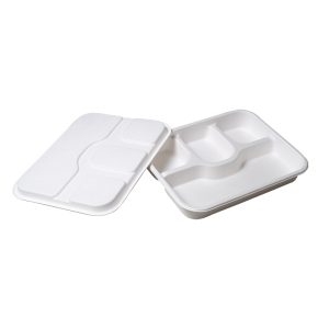 The Sugarcane Bagasse 5CP Meal Tray with Lid Classi Bio combines sustainability with practicality. Made from sugarcane bagasse, this tray is perfect for serving complete meals with five compartments for main courses, side dishes, desserts, and sauces or condiments. Chemical-free and compostable, it offers an eco-friendly alternative to traditional plastic and Styrofoam trays, suitable for various dining settings.